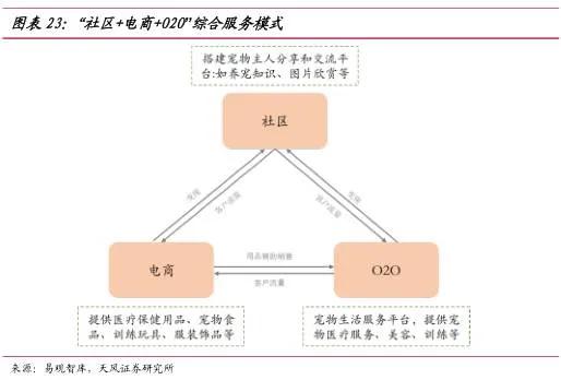 对于宠物主人而言,宠物的医疗、食品、训练、美容等综合服务的需求旺盛,平台化的一体式服务更容易吸引消费者。“社区+电商+O2O”综合服务模式下,社区为宠物主人提供了交流平台,为电商和O2O引导客户流量;O2O吸引用户体验线下的医疗服务,同时带动了社区的宣传和电商的销售。电商和O2O成为社区主要的变现平台,内容上相辅相成,但是投入成本高,产品线的建立周期长。