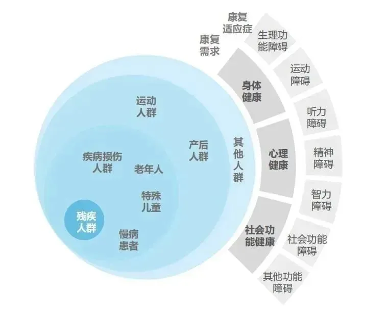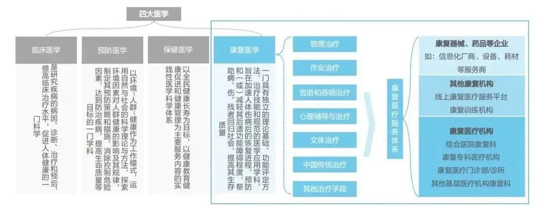 其中,中国已成康复最大需求国;产后、运动康复利好;以及未来行业发展趋势部分尤其值得关注!◆ 康复医疗定义: 医疗服务的重要组成部分,以疾病、损伤导致的躯体功能与结构障碍、个体活动以及参与能力受限的患者为服务对象,以提高伤、病、残人士的生存质量和重返社会为专业特征。◆ 康复医疗研究范畴:以康复医学理论为基础,以医学康复治疗为手段,搭建的康复医疗服务体系。