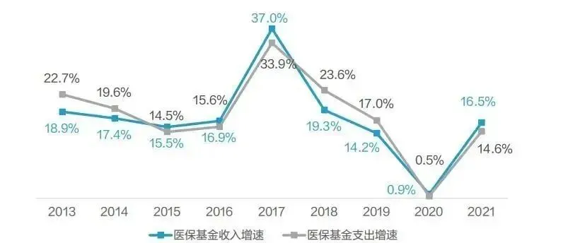 在居民日益增长的医疗需求下,我国医保基金或将面临缺口◆ 我国人口老龄化问题不断深化,劳动力占比下降;同时,老年人的患病率提升,居民的医疗需求和花费不断增加,社会保障体系负荷再次升级。◆ 我国医保基金的支出逐年提升,支出增速在2017年之后再次高于收入增速。其中,2020年受疫情和部分地区医保实施减免政策的影响,收支增速下降。尽管2021年底我国医保基金累计结存达36121.54亿元,但据社科院战略研究院戈艳霞在2021年的测算显示,在现有的社保制度下,到2026年,医保基金的当年结存将首次出现缺口。预计到2034年,累计结存将首次出现缺口。◆ 对此,国家将应对老龄化升级至国家战略水平,需要进一步促进全民健康,注重预防、治疗、康复三者的结合,减少医保基金的支出。