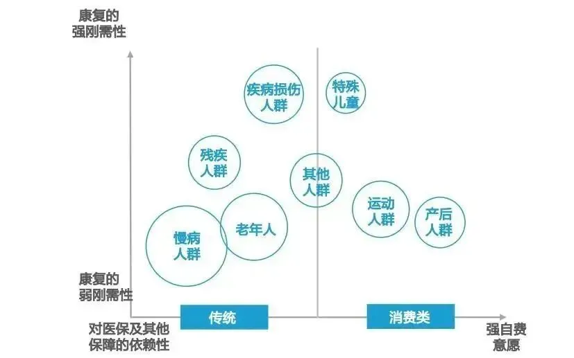 提高医院运营效率:通过康复医疗,提高医疗治疗水平,缩短住院周期提高床位周转率。为后期DRG/DIP的实施做好成本管控。减轻社会保障体系负担:患者重返社会,能够再次提供劳动,减少残疾补助、失业保障的支出;同时,通过改善患者预后,能减少医保基金的使用。需求端现状:康复医疗目标人群多元化,诊疗需求向消费类拓展◆ 康复人群扩展:医疗康复的目标人群最早针对于残疾人群,而后疾病损伤患者、老年人、慢病患者等也逐步成为国家重点关注的人群。现今,随着健康素养提升,康复医疗的需求人群扩展至运动、产后女性等群体。通过对人群的康复需求程度以及自费意愿的强弱进行分析,发现人群的需求从传统的康复领域向消费级康复延伸。
