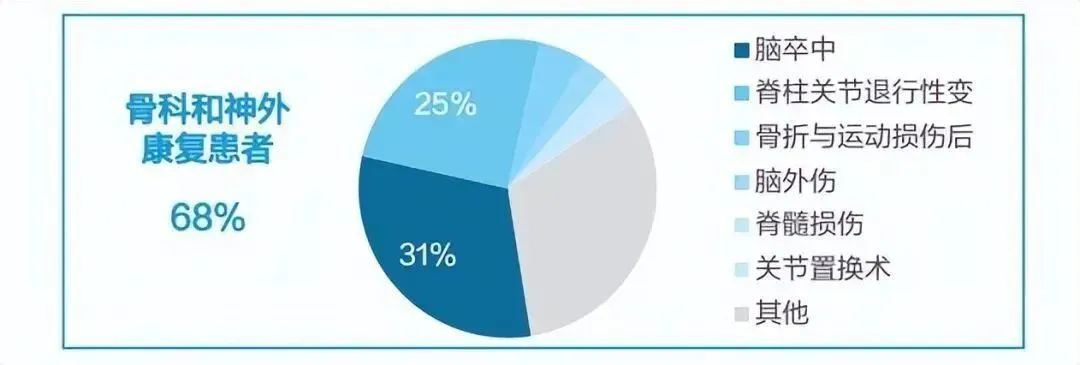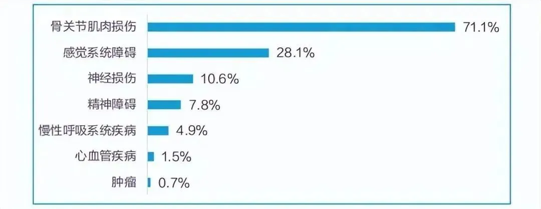 公立等级医院主要承担(亚)急性期康复需求,但资源不足,且集中在骨科和神经康复,难以负荷多元化的康复需求◆ 等级医院需要承担急性期、亚急性期的康复服务。然而,由于各地区和医院对康复科的重视程度不一,康复资源的缺口较大。2018年随着康复热潮的退散,综合医院康复病房的配置率下降至28.46%;而我国公立专科康复医院的数量到2020年也仅有166家。◆ 与此同时,公立医院虽然整体实力强,但重点收治神经康复和骨关节康复的患者,对于其他心脏康复、肿瘤康复的患者收治比例较少。然而, 根据柳叶刀发布的2019年全球疾病负担数据显示,全球对康复服务的需求中除了骨关节肌肉外,感觉系统障碍、精神障碍等康复需求也较大。2016-2018年中国综合医院的康复病房配置情况