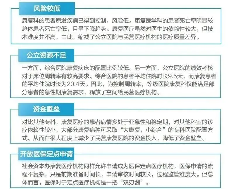 康复医疗行业的公立资源短缺、技术与资金壁垒较低,且开放医保定点申请,利好社会办医◆ 康复医疗行业在我国的发展历程尚短,公立康复医疗资源也仍在补充阶段。然而,由于康复医疗本身对于其他科室治疗的依赖性较弱,开放医保定点申请,技术不复杂,资产投入相对于其他专科少等因素,有利于社会资本介入创办医疗机构。