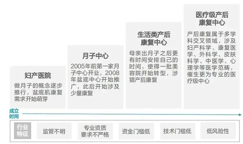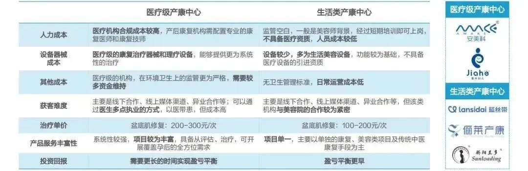 机构经营:投入成本低,盈亏平衡周期较短,其中,医疗级的潜力更大◆ 对比产康中心经营情况,虽然两类机构的服务费用较运动康复低廉,盆底修复价格约为200元/次。但产后康复中心的整体投入成本相对其他细分市场少,机构的回报性仍然较好。据多位从业者表述,一、二线城市机构的盈亏平衡周期可在6个月至1年。◆ 尽管医疗级产康中心在各类成本上都不具备优势,但是由于机构良莠不齐,行业对与非医疗类机构的信任感有所降低,医疗级产康中心具备的专业资质优势,将会给顾客带来更系统性的治疗,项目的丰富性得到提升,其发展潜力更强。