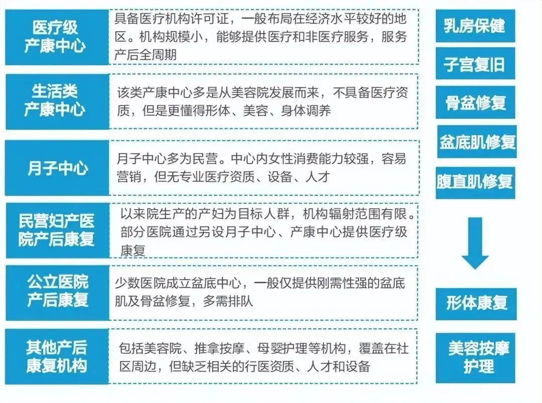 产后康复需求:适应人群扩展,且需求多样化,但由于女性在产后闲暇时间少,机构康复人群占比低◆ 女性在产后面临着多方面的困扰,为解决此类痛点,产后康复行业顺势而生。约有1/3产妇在产后出现不同程度的盆底功能障碍,其中尿失禁最为常见。因此,盆底肌康复作为基础项目,刚需性较强。◆ 在需求服务上,随着人群对美的关注提升,产后康复已经从较为刚需的盆底肌、骨盆、腹直肌修复,延伸到对身材管理、美容护理等升级的需求。由此,行业也迎来了新的市场需求。◆ 然而,由于产后女性多难以脱身,外出康复治疗时间少,实际产后康复机构的渗透率仅有20.6%。