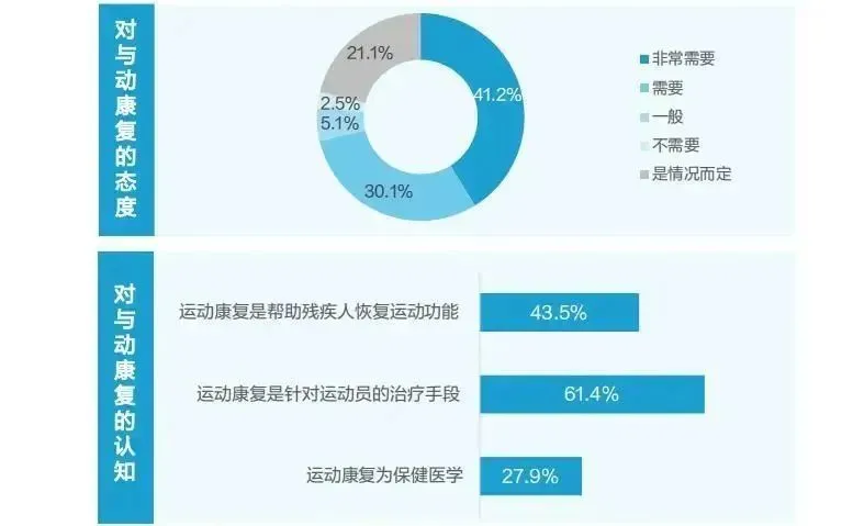 运动康复需求:适合所有需要运动治疗的人群,但多数人群认知存在偏差◆ 运动康复潜在需求较大:随着运动的普及,我国7岁以上参加体育锻炼人数占比超37.2%,运动损伤人群逐年增加。中华医学会运动医疗分会主任委员陈世益教授表示我国有超过35%的国民参与运动,其中,10%的人可能会发生运动损伤。而今,运动康复的范畴从运动员、运动人群, 拓展至所有运动康复训练需求的人群。◆ 运动康复渗透率低:人群对与运动康复的态度较好,41.2%的人群认为非常需要,但是在认知上存在偏差,导致实际进行运动康复的人较少。