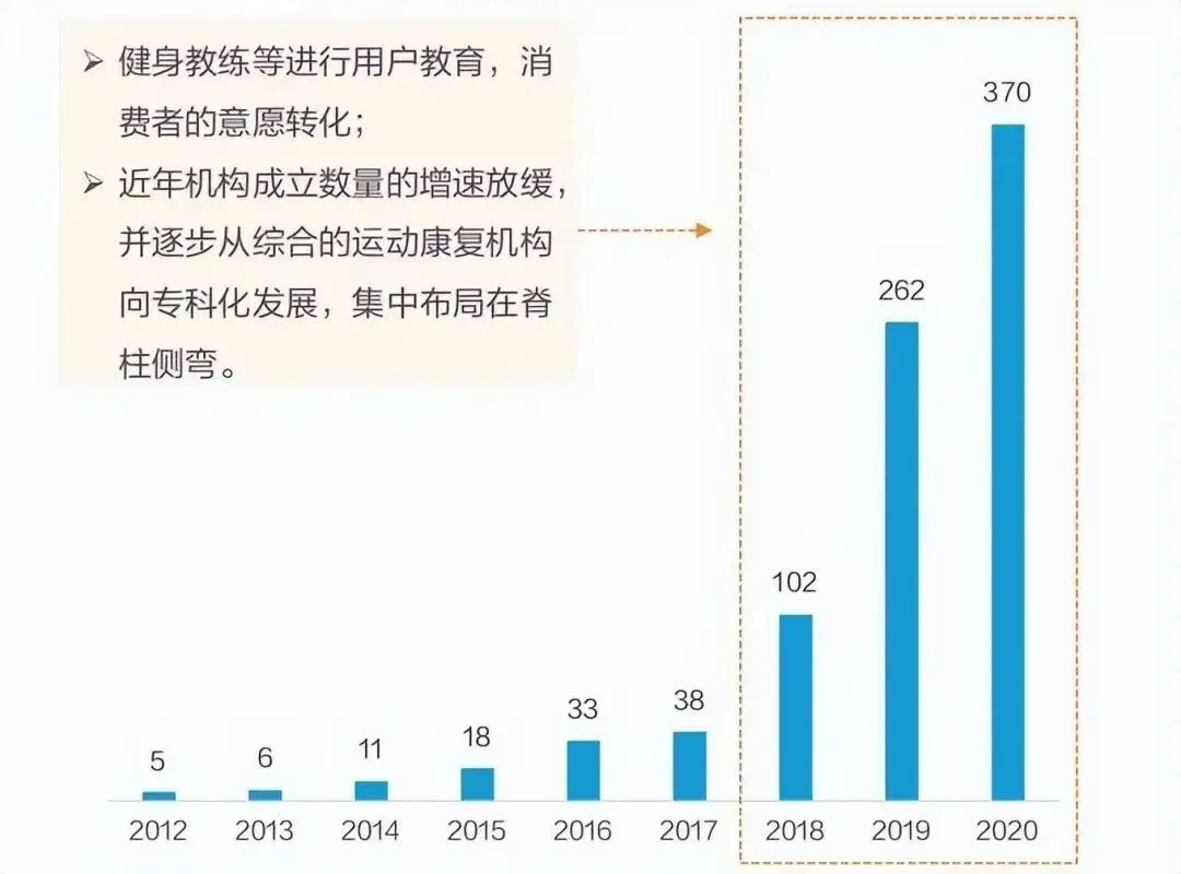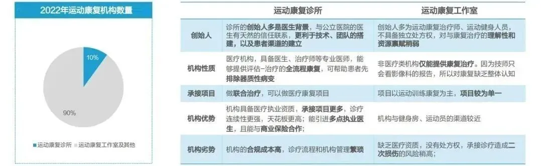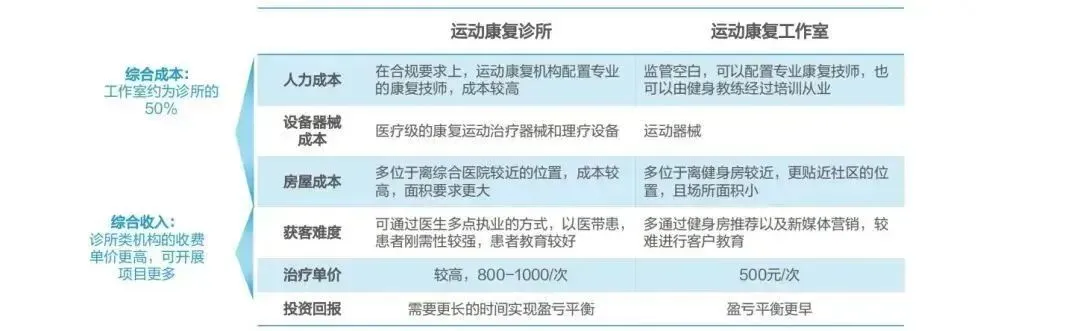机构经营:半数以上机构能够盈利,其中,运动康复诊所的运营成本较重, 但收入的可拓展空间更大◆ 据亿欧通过多位企业专家访谈了解,在一线城市,50%以上的机构能够实现盈利,仅不足20%的机构面临亏损。对比运动康复诊所和工作室的经营情况,在人力成本、设备成本、房屋成本等方面,诊所由于合规性要求,其成本平均为工作室的2倍。◆ 在收入方面,稳定的获客渠道是影响是机构能否持续的主要因素。机构通过异业合作、医生转诊、线上广告、新媒体营销等多重渠道并行。其中,运动员与健身背景的工作室的主要客户来源于健身房;而诊所则可通过医生多点执业,采取医带患的形式,具有较高的依从性。