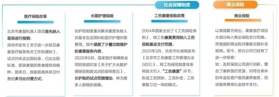 支付趋势:社保和商保将进一步为康复医疗行业发展护航◆ 康复医疗的支付问题限制行业的发展。循迹当前的医保和商保发展,未来,康复医疗的支付压力将逐步降低。社会保障制度中,我国将继续医疗支付改革,升级康复医疗的支付方式。另外,在部分地区也已经展开了多元化付费的尝试。此外,长期护理保险、工伤保险的服务内容拓宽,涵盖一部分康复医疗费用。◆ 而商业保险发挥其补充保障作用,首先关注老年人的康复需求,整合康养服务资源,在产品中纳入康复医疗服务。尽管当前的康养保障力度较弱,但遵循美国康复医疗保险的支付路径,或将有更多的服务被纳入商保。