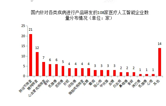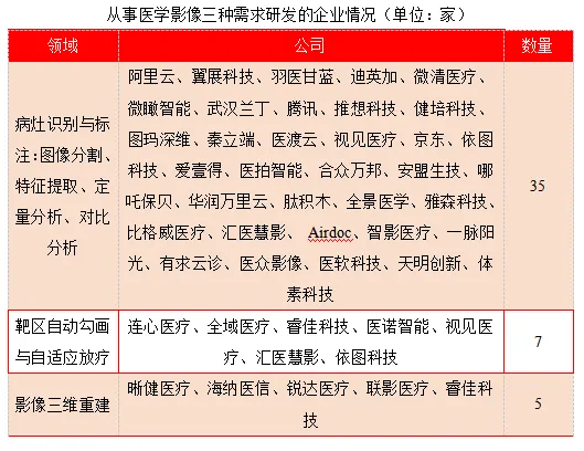 数据来源:前瞻产业研究院、博裕金融懂医行数据库以其中108家企业产品研究方向布局来看,肺结节筛查、糖网筛查是两大热门方向,集结的医疗人工智能企业数量共计有33家,占比约30.6%;但同时也有相当多的企业将目光投向了心血管类疾病方面,企业数量超过了10家,由此可以看出国内医疗人工智能企业细分赛道呈现出分散竞争态势。而从各类医疗人工智能产品具体的布局企业来看,两大热门产品医学影像和疾病风险预测聚集的企业较多,根据统计,目前有43家企业提供医学影像服务,主要有阿里云、翼展科技、昕健医疗等;有45家企业提供疾病风险预测服务,这些企业有图玛深维、贝瑞健康、博奥生物等。可以说这两个两个领域企业扎堆布局。目前,人工智能技术主要应用在医学影像的诊断环节,解决以下三种需求:1)病灶识别与标注:针对医学影像进行图像分割、特征提取、定量分析、对比分析等工作;2)靶区自动勾画与自适应放疗:针对肿瘤放疗环节的影像进行处理;3)影像三维重建:在人工智能进行识别的基础上进行三维重建,针对手术环节的应用。目前我国共有43家公司提供“医学影像”服务,其中,定位于病灶区识别与标注领域的公司最多,共有35家。第一大类是互联网科技巨头公司,如谷歌、微软、阿里、腾讯等。其强大的财力和技术可以支持他们进行跨界布局。这些企业大多掌握着较先进的人工智能技术,具备在医学影像应用层面取得突破的优势;第二大类是设备型企业。该类企业在国内的代表是联影、迈瑞等。其特点是主营设备类产品,依靠医学影像设备或者影像管理写作系统进入医疗机构,技能获取数据又能产生一定的营收。同时,他们还能依靠公司的其他业务收入支持人工智能业务。第三大类是专研技术的公司。例如依图科技、汇医慧影、深睿科技、推想科技等。他们基于场景或行业数据,聚焦于应用层的建设,提供最终的解决方案。技术型公司大多拥有自己的算法、在人工智能医学影像领域布局较早,在准确率上也更有保证,因而颇受资本的青睐,主要依靠融资和微薄的收入支撑业务发展。疾病风险预测是指通过基因测序与检测,提前预测疾病发生的风险。疾病风险预测核心解决的问题是预测个体在未来一段时间内患某种疾病或(发生某种事件)的风险概率。疾病预测会根据某个人群定义,例如全人群、房颤人群、心梗住院人群等,针对某个预测目标,例如脑卒中、心衰、死亡等,设定特定的时间窗口,包括做出预测的时间点,和将要预测的时间窗,预测目标的发生概率。- 心脏病患者死亡预测:英国科学家在《放射学(Radiology)》杂志上发表文章,研究结果认为人工智能可以预测心脏病人何时死亡。英国医学研究委员会下的MRC伦敦医学科学研究所称,人工智能软件通过分析血液检测结果和心脏扫描结果,可以发现心脏即将衰竭的迹象。