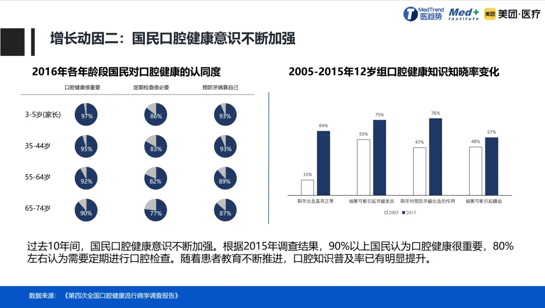 居民可支配收入不断提高、口腔健康意识觉醒等多重因素利好口腔医疗行业持续高增长。当前我国国民口腔患病率高,就诊率低,口腔健康状况亟待改善。《第四次全国口腔健康流行病学调查报告》(2017)显示,我国儿童龋齿率呈快速增长趋势;中老年人牙周状况较差,人均缺失牙6~9颗。随着口腔知识普及率提升,国民口腔健康意识正在不断加强,定期口腔检查、口腔预防等意识逐渐深入人心。