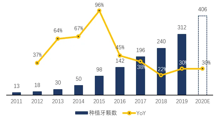 据国家卫健委数据与Med+研究院相关模型测算,2020年国内正畸和种植牙市场规模分别达到276亿元、240亿元,已成为口腔医疗中规模最大的细分领域。我国种植市场10年复合增长率达到48%,是全球增长最快的种植牙市场之一,种植牙总量从2011年的13万颗增长到2020年406万颗。据Med+研究院测算,种植牙的潜在市场规模达约1600亿。
