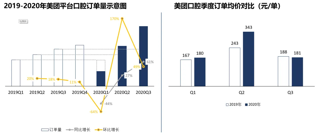 2020年初,新冠疫情冲击下,口腔医疗产业从上游供应商到下游医疗机构,营业额均出现大幅下滑。然而,短期的冲击并没有改变口腔医疗消费高度景气的基本面。在后疫情时代,我们看到了口腔消费的深“V”反转。美团平台数据显示:口腔医疗订单量与均价皆超过去年同期水平,经营者未来扩张业务意愿普遍较强。