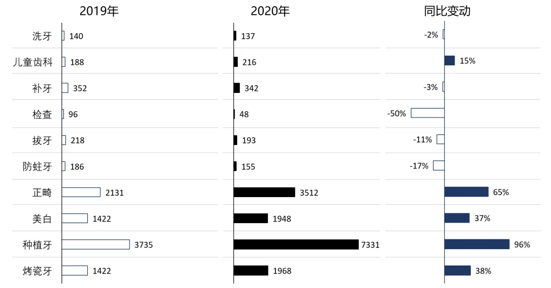 2020年,疫情在初期对口腔医疗机构影响明显。2020年前三季度,美团平台的口腔店铺关店率显著上升;与此同时,二季度后平台上的开店率大幅回升,开店数量超过去年同期。据美团平台商家调研显示,截止2020年11月,62%的口腔机构表示营业额同比上升或与去年持平。疫情后,口腔机构经营者对行业仍保持乐观态度,73%以上的经营者表示有意向扩大经营规模。2. 口腔医疗价格两极分化,高值服务成为核心竞争力值得注意的是,口腔医疗项目价格呈现两极分化走势:诸如拔牙、补牙、洗牙等基础、低附加值的项目价格出现下降,基础检查费用降幅达50%;与此同时,种植牙、正畸等对技术要求较高的项目价格上涨明显。正畸订单均价从2131元上涨到3512元,种植牙订单均价从3735元上升到7331元。