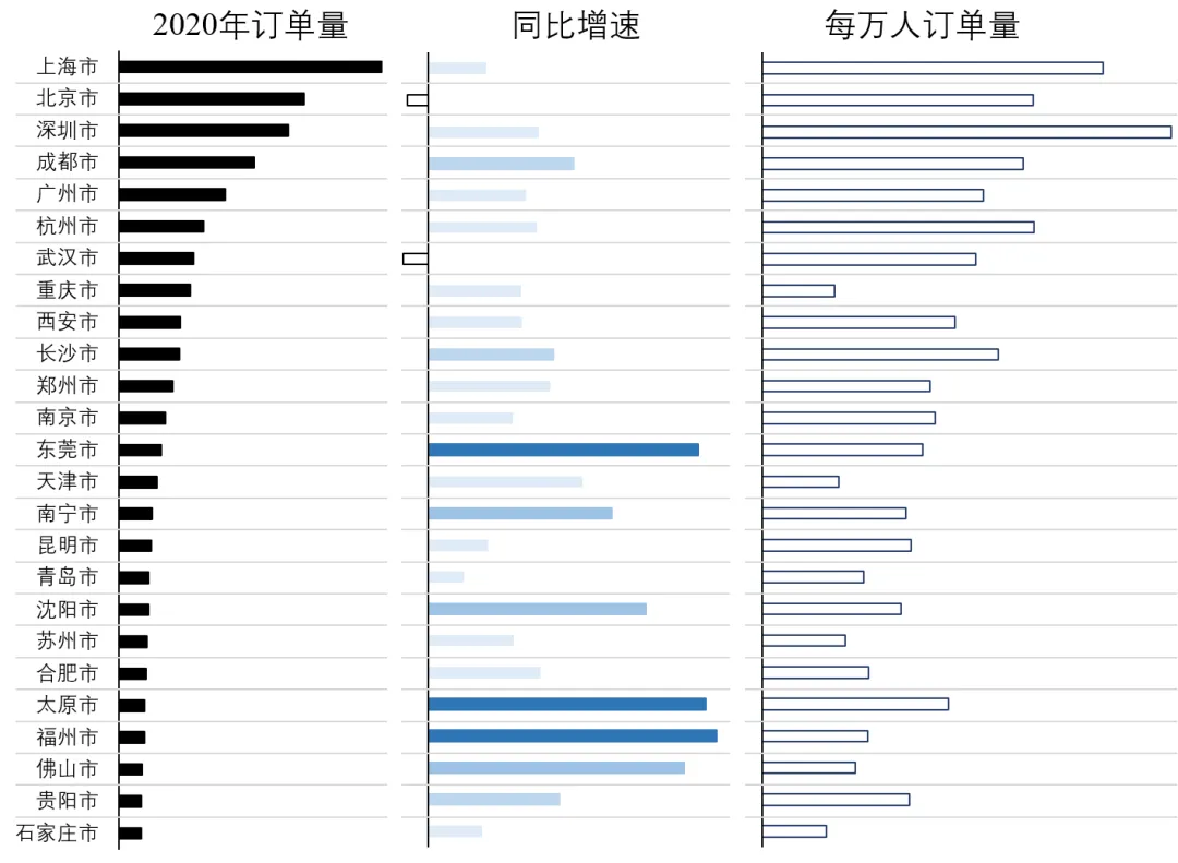 图:2019~2020年美团平台口腔项目订单价变动情况美团平台订单数据显示,高技术、高附加值项目在口腔医疗行业中的占比将快速提升,预期未来成为重要的利润来源。2020年在美团平台上口腔订单量最多的5个城市人口均在千万以上,依次为上海、北京、深圳、成都、广州。其中,深圳、上海、杭州每万人订单数分列前三,显示出较高的渗透率。