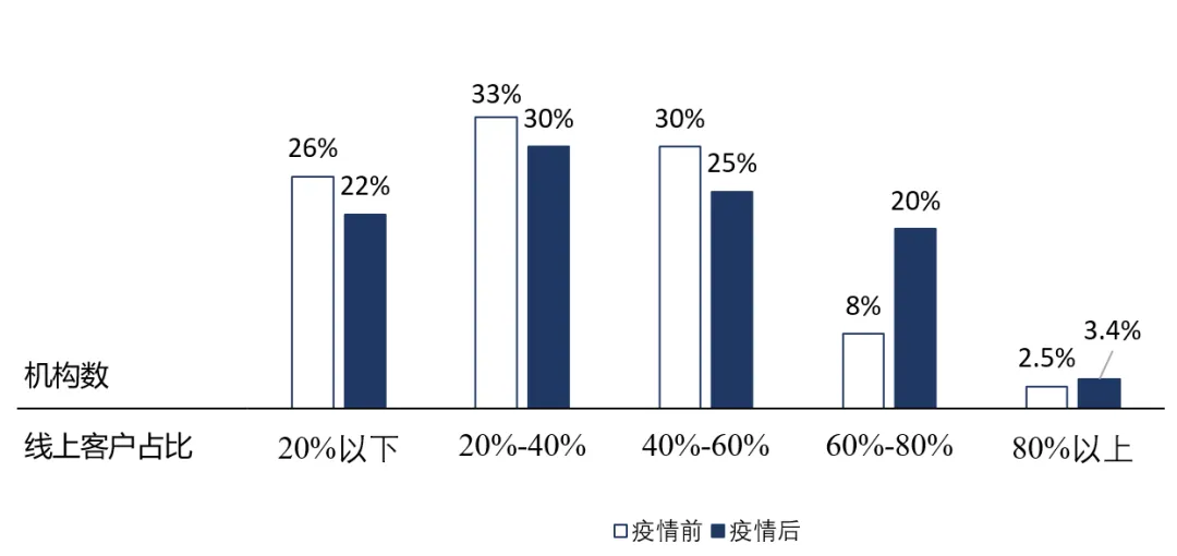 从增速来看,二三线城市增速普遍高于一线城市。其中,福州、太原、东莞同比分别增长76%,73%,71%。人口规模在500~1000万的二三线城市,口腔市场增量广阔。后疫情时代,线上问诊成为新趋势。据Med+研究院问卷调查,疫情前口腔医疗机构线上渠道客户平均占比为38%,疫情后增长到43%。(注:本报告针对口腔医疗机构样本量n=526)。