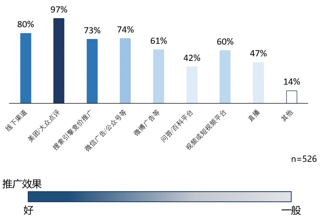 在传统的线下推广渠道之外,口腔医疗机构尝试了多种推广渠道,包括美团、搜索引擎、微信/微博等平台。从推广效果来看,约75%的口腔医疗机构认为美团(包括美团APP、大众点评APP)的推广效果最好,其次为搜索引擎和线下渠道,比例分别为47%、43%。