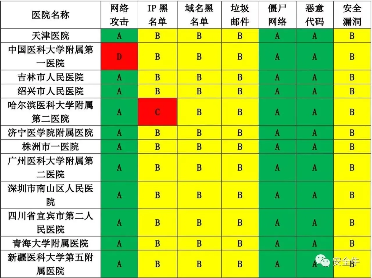 即使评分较高的前十家三甲医院对漏洞、黑名单、垃圾邮件的关注度也很低