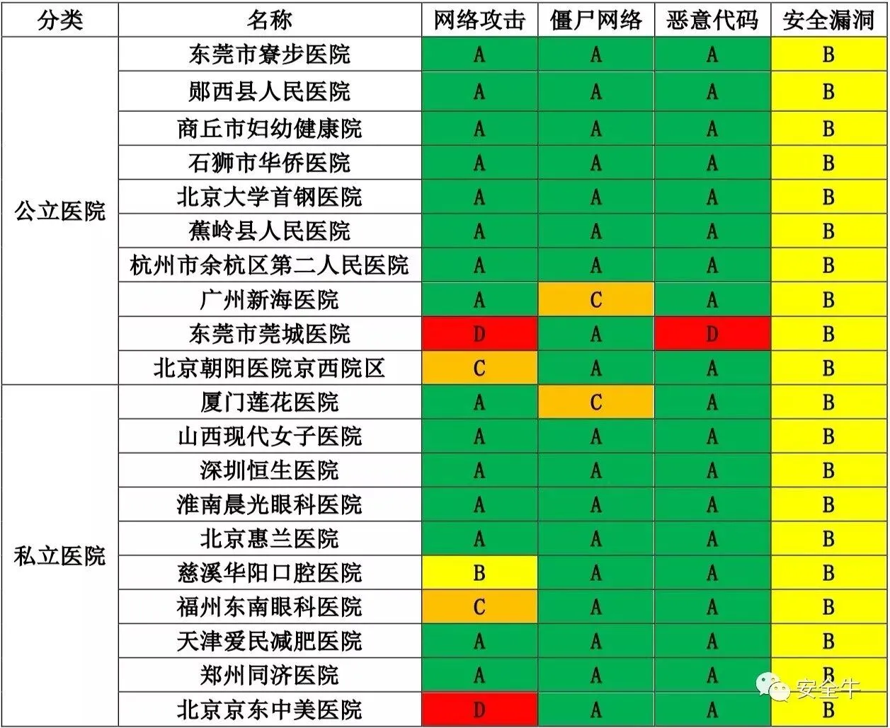 全国排名前十的三甲医院中,网络攻击、僵尸网络、恶意代码等三大危害最大的风险控制普遍较好,但是对存在的漏洞、IP黑名单、域名黑名单、垃圾邮件等关注较少。