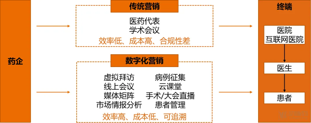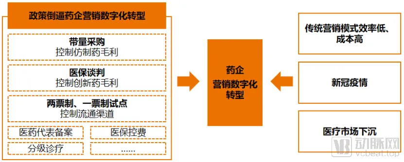 从2017年开始,带量采购、医保谈判、两票制、一票制试点、合规等相关政策的施行,让国内处方药市场,尤其是仿制药市场,开始逐步脱离长期以来形成的高毛利业态。利润被逐步压缩之后,以人力为基础的传统营销模式高成本、低效率的痛点显现。随着医疗市场下沉,基层市场也成了药企争抢的一块蛋糕,但是基层医疗机构普遍规模小、分布范围广、距离偏远,依靠传统的营销手段难以有效覆盖这块市场。而数字化营销具有成本低、效率高、广覆盖、可追溯的优势,能让药企能以更低的成本高效覆盖更广阔的市场,且满足合规要求。2020年的新冠肺炎疫情切断了医药代表与医生之间的线下联系,极大地加快了数字化营销的发展。