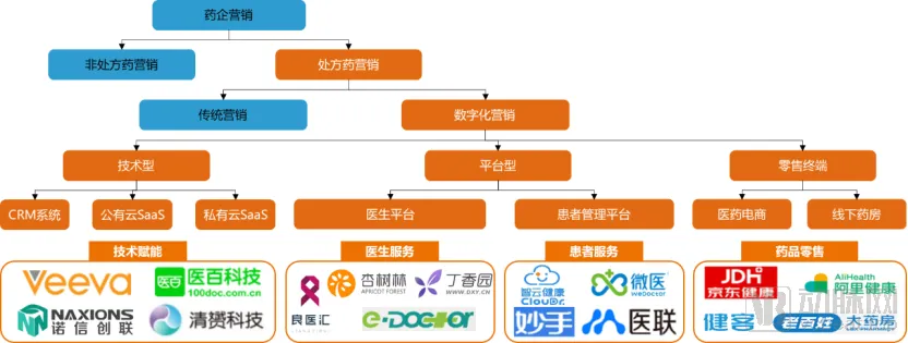 根据提供服务内容以及商业模式的不同,医药数字化营销企业分为提供技术型、平台型和零售终端三大类型。