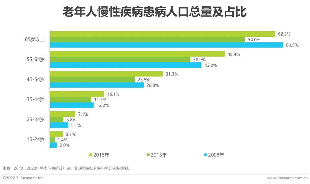 作为世界上唯一老龄人口过亿的国家,第七次全国人口普查结果显示,较2010年第六次全国人口普查,我国60岁及以上人口占比上升5.4%,其中65岁及以上人口占全国人口的13.5%,老龄化进程加快;老龄人口基数大、慢性疾病患病率高,我国65岁以上人群患慢性疾病比例为62.3%,且据统计直至2020年,由慢性病导致的疾病负担占总疾病负担的近70%,导致的死亡人数占我国总死亡人数的86.6%。老年护理已成为中国社会的“刚需”,解决老年护理的供给不足,保障高质量老年生活是人民日益增长美好生活的重要组成部分。通过信息化手段介入来优化医疗保障体系、促成养老模式的创新发展,实现“老有所养”、“智养质养”可极大程度减轻由人口老龄化、慢性疾病等引起的医疗服务负担。