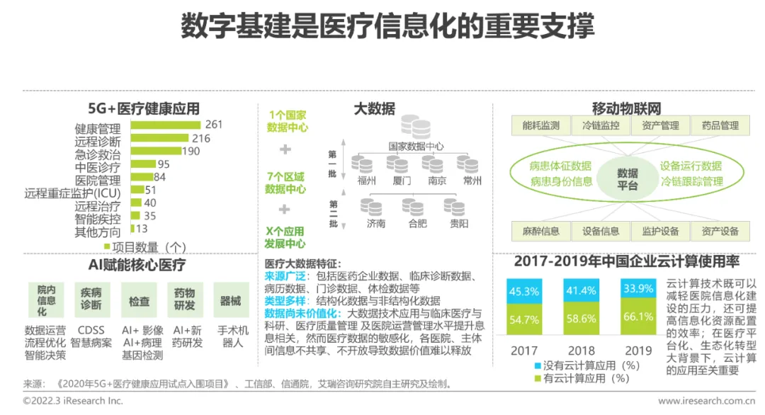 5G、大数据、移动物联网、云计算等是医疗信息化的技术底座,支撑大量垂直医疗场景的信息化应用。我国是全球规模最大、技术最先进的5G独立组网网络,5G与医疗健康领域的结合能有效加强患者与医护人员、医疗机构、医疗设备间的实时互动;多源异构、海量的医疗数据蕴含高价值信息的知识库与资源库,数据资产挖掘重构医疗信息化建设内容及方向。在2016年颁布的《关于促进和规范健康医疗大数据应用发展的指导意见》引导下,我国健康医疗大数据中心建设工作如火如荼展开,1个国家数据中心+7个区域数据中心+X个应用发展中心的总体规划逐步成型,推动数据流、信息流于全国范围内高效流动;此外,大数据与人工智能改变医疗知识发现的路径与方式,创新医疗诊断与决策的方式和渠道,物联网和云计算变革了医疗信息共享和服务模式;可预见的是,未来新一代信息技术与医疗信息化建设将实现更深层次的融合。