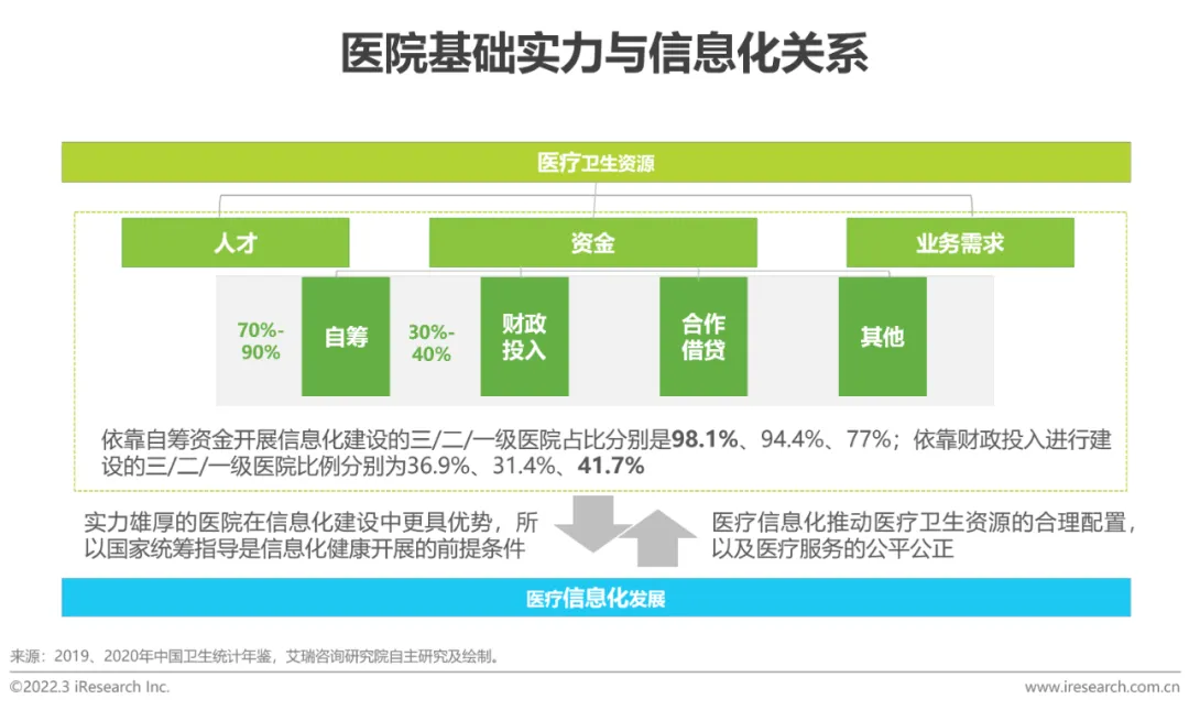 我国面临医疗资源分布不均、服务水平差异大、医疗服务供需缺口持续扩大的基本国情。2020年中国卫生统计年鉴显示,无论是医院数量、三级医院数量,还是卫生技术人员总数及执业医师数量,东部地区明显多于中部、西部。经济发达的东部地区汇聚顶尖医疗资源,而人口更密集的城镇、农村及边缘地区甚至面临缺医少药的问题,这些地区人民一旦发生重大疾病,就会选择大城市就医,不仅增加了居民就医成本,还会加剧医疗资源的紧张和医护人员压力、医患矛盾。借助科学手段,推动卫生医疗服务体系数智化升级是摆脱困境的重要举措。当然,若没有国家顶层设计统筹,医疗信息化的全面铺开只会让马太效应愈加明显。具体而言,信息化资金核心来源为医院自筹与财政拨款,三级医院凭借其规模化的医疗IT投入、医疗及医信人才吸纳能力,打好信息化建设基础条件,并能在其业务发展内生需求推动下持续投入,长此以往构筑越来越高的医疗服务壁垒;相较之下,一级及未定级医院若既无医疗服务水平提升的驱动、也无国家政策及资金、人才等支撑,转型只会进展缓慢。