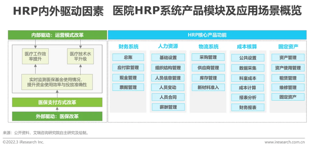 在深化医改与多元化办医格局下,HRP(医院资源管理系统)逐渐成为医院精益管理不可或缺的工具。HRP是传统HIS系统中人财物事、药品耗材、资产设备等管理模块的深化应用,其核心功能是通过实现业务系统与财务系统之间的集成与共享,提高医院运营效率,并为医院全面经济核算科学决策提供依据,是提升医疗服务质量的重要手段。HRP与HIS系统的产品定位及面向客群略有不同,自2000年,以经济运营为核心的HRP旨在用成本撬动医院资源的管控;随后,厂商发现同样HRP系统在不同医院的成本控制表现差异大,自此HRP产品定位由经济运营逐渐转向深化管理及战略管控,旨在辅助不同医院客户实现精益运营。现阶段HRP的核心客群仍然是三级以上的医院,三级以下医院整体认知不深、投入不足,未来在医保改革、多元化复合付费方式的驱动下,市场迎来新机会点。