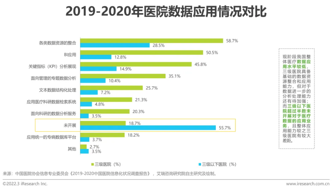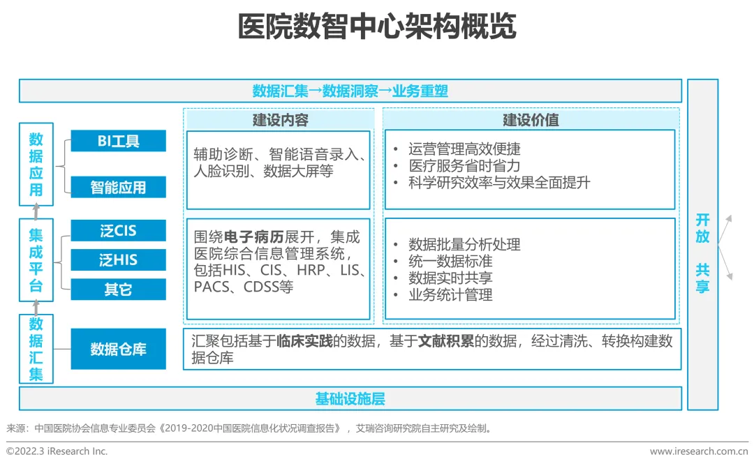艾瑞将服务于医院自身、医院与院外信息共享的集成平台、大数据分析平台、数据库等软件产品统一定义为“医疗数智中心”,其主要任务以满足临床信息、医疗服务信息、医疗管理信息的共享和协同应用为目标,汇集相关业务数据,并对外部系统提供数据交换服务(包括与区域平台的数据交换)。随着医院对数据互通互联的需求激增,数智中心的价值不言而喻。数智中心是医疗服务增质提效的基础,比方说医生毋需统计与分析诊疗数据,仅需基于数据应用工具即可快速洞察患者病情,制定精细的定制化诊疗方案,这样既能为患者提供更贴心的诊疗服务,也能使医护人员专注于核心医疗服务能力的提升,以及疑难病种的解决;其次,基于区域级数据的实时监控与开放共享,数智中心赋能区域医疗信息化建设,远程诊疗与分级会诊的需求更容易被满足,比方说区域三级医院通过开放实时床位统计数据,让病症较重的病人轻松转院,反之亦然。