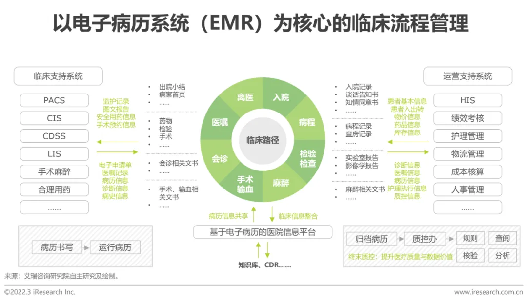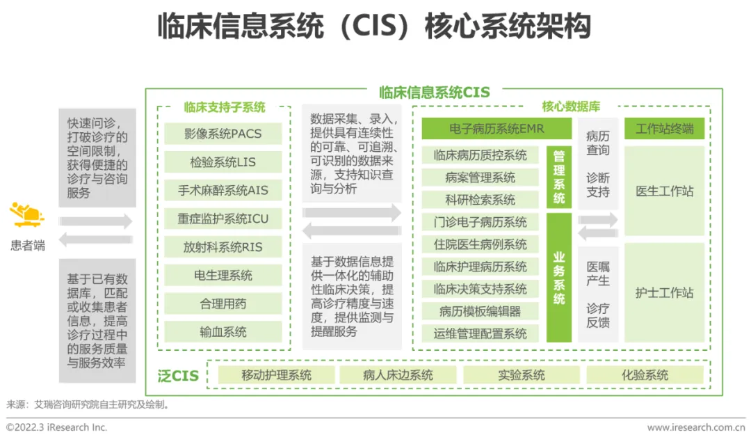 CIS(临床信息系统)服务于病情诊断和处理、医学研究等临床活动,以患者为核心,借助多种软件系统整合患者临床诊疗数据,实现医疗过程管理的质效提升是其核心功能。目前我国大多数医院正处于CIS建设阶段,CIS相较于HIS建设难度更大,因为临床数据治理难度大且临床业务变更频繁,尚未形成统一的建设路径,医院需要根据自身特点与需求引入系统。未来,为进一步发挥临床过程辅助功能,CIS将会结合大数据、人工智能等新技术,由提速增效的信息化管理向数据整合、智能分析迈进,进一步解决医疗资源短缺的核心问题。