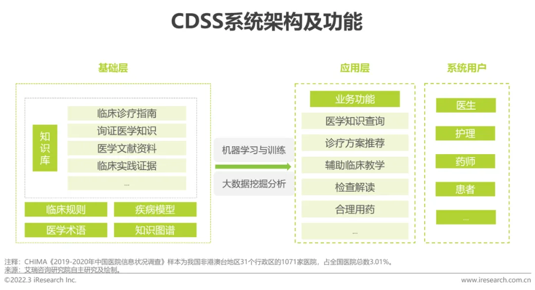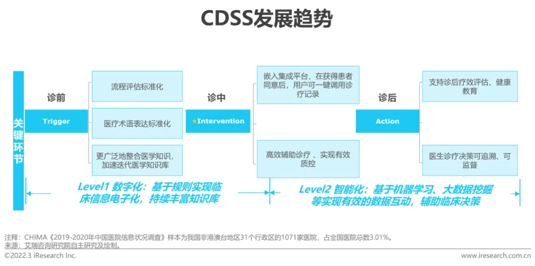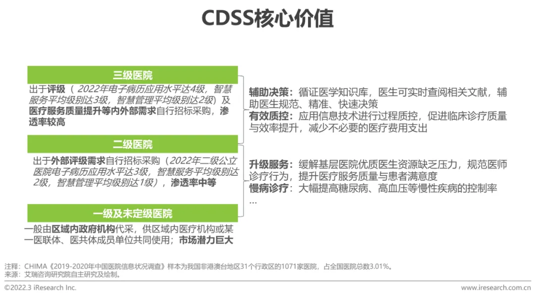CDSS(临床决策支持系统)是基于人工智能、深度学习等技术,结合医学知识、临床案例和患者病情, 辅助医生分析病历,制定准确有效治疗方案的工具,具备减少医疗差错、提高医疗效率、控制医疗费用支出等优势。当下CDSS已进入规模化应用阶段,于三级医院覆盖面较广,二级及以下公立医院仍具备较大的市场潜力。CHIMA调研报告显示有66.47%的医院认为临床辅助决策系统是当下医院信息系统建设中需要关注的第三位(前二分别是电子病历集成与医疗质量监管)。现下医院评级仍是CDSS的核心外驱,整体看产品同质化程度较高,厂商若想在保持客单价的情况下加速市场拓展,仍需提升其产品质量,使其发挥应用的临床价值。如加速完整、专业的医疗知识库的构建;实现信息实时共享,避免信息重复录用、跨级调用困难等问题出现;深挖终端用户需求,采用更灵活的交付方式,建立标准化系统,提高系统的适用性等。