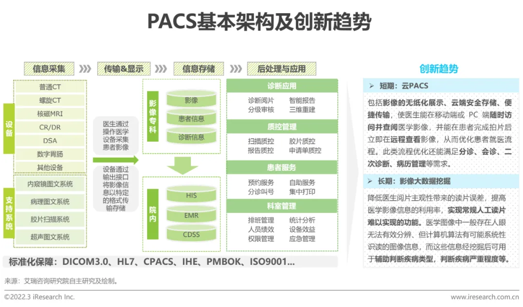 PACS(医学影像信息系统)是基于医学影像存储与通信系统,从技术上解决图像处理技术的管理系统。随着现代医学发展,传统医学影像管理方法已无法适应现代医学影像管理的要求,无胶片化影像科和数字化医院已经成为现代化医疗发展的必然趋势。PACS的功能价值在于通过联接不同的影像设备,存储与管理图像,图像的调用与后处理,实现资源共享,降低成本,达到提高工作效率、提升医疗水平的目的。基于医学信息流动、共享的需求,云PACS及影像大数据的挖掘已成为PACS发展的创新趋势,值得市场关注。