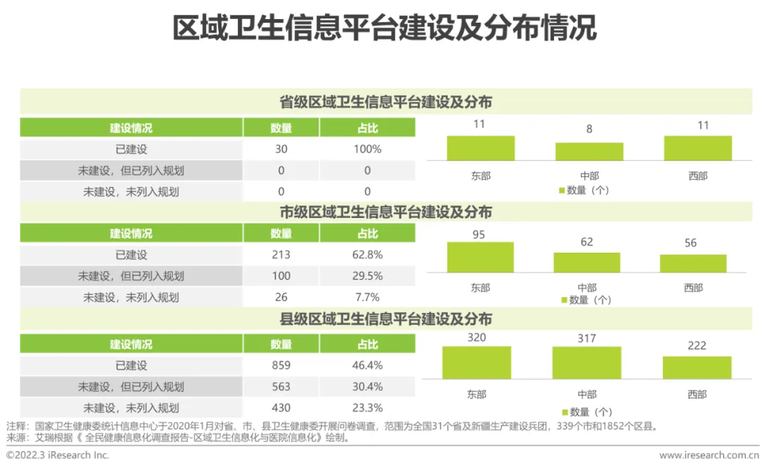 根据国家卫生健康委统计信息中心调查结果,我国省、市、县级区域卫生信息平台建设率分别达到100%、62.8%和46.4%,其中省级区域卫生信息平台建设比较均衡,市级平台东部地区发展明显较快,县级平台东部与中部地区基本持平,西部地区仍处于较落后状态。在平台基础功能建设方面,目前建设率较高的基础功能点主要集中于各级平台间的数据交换共享以及平台的日常管理。