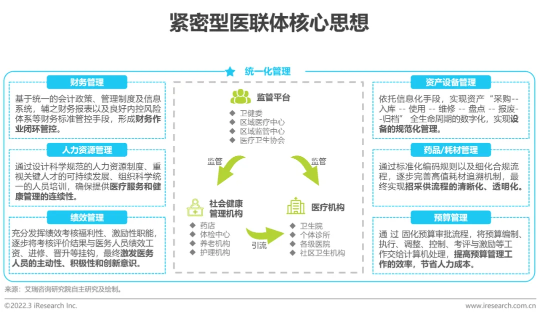 目前我国区域医疗信息化的建设存在缺乏完善的长远战略规划和研究、数据格式不统一、大系统的集成和整合经验不足等痛点,归根溯源,核心问题仍在于尚未形成“统一化管理”的意识,各区域以自我为中心、“各自为政”的现象严重,导致医疗资源无法在区域内进行有效的共享。艾瑞认为,通过统一化管理建立紧密型医联体,促进人力资源有效双向流动,规范与提升基层诊疗质量,搭建多形式、多维度医疗支援平台,是扎实推进医联体内涵质量、有效实施分级诊疗、大力推进双向转诊的有效举措。