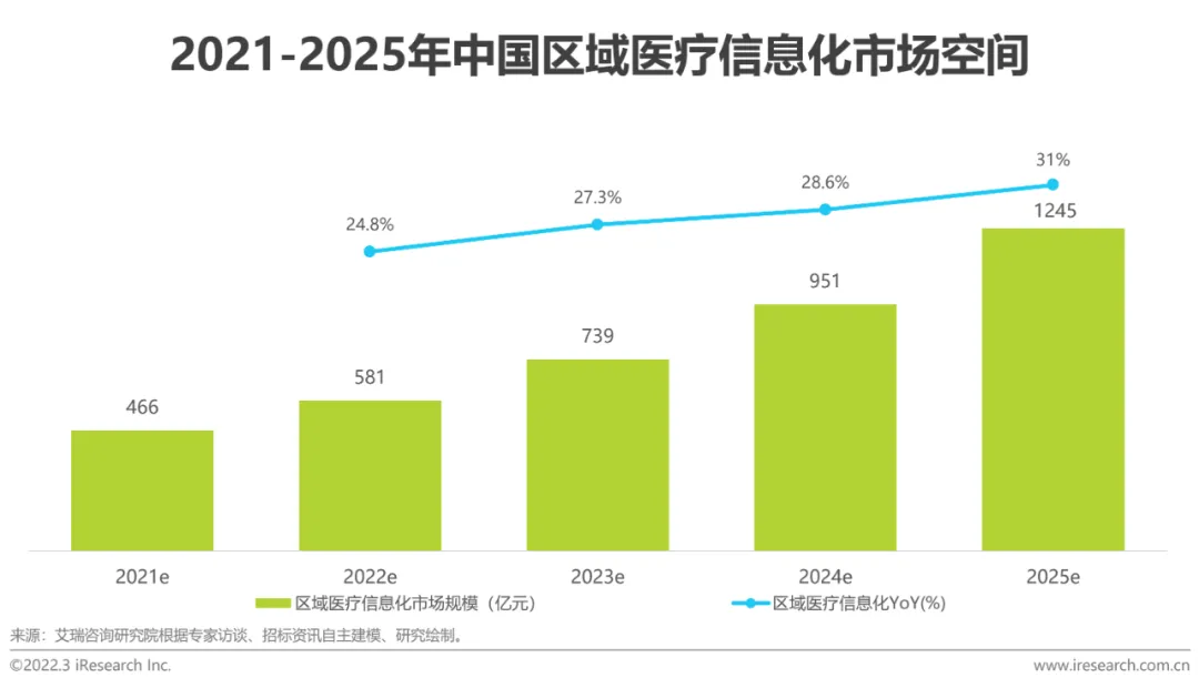 医改、医疗信息化相关政策是区域医疗信息化建设的核心驱动因素。为贯彻落实“十四五规划”、《公立医院高质量发展促进行动(2021-2025年)》等,进一步巩固县医院综合能力建设成果,卫健委于2021年10月颁布《“千县工程”县医院综合能力提升工作方案(2021-2025年)》,提出到2025年,全国至少1000家县医院达到三级医院医疗服务能力水平的目标,侧面证实区域医疗信息化市场空间的增长潜力。艾瑞预测2021年中国区域医疗信息化市场空间为466亿,2021-2025年复合增长率为27.9%,2025年市场空间可达1245亿。