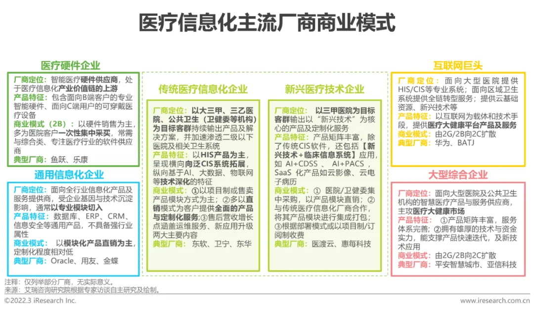 艾瑞基于商业模式/产品技术应用等维度将众多厂商类型分为传统与新兴两大类,其中传统医疗信息化服务商包括专注于医疗信息化领域的大型企业与具有地域性质的中小型企业,提供传统的IT业务,具备多年发展积累的产品经验、服务优势以及市场先发优势;新兴服务商包括跨界大型企业与技术创新型企业,一般通过模式创新与技术创新形成优势,提供医疗解决方案。此外,头部厂商多在营销运营能力、渠道能力、技术能力等层面具备一个或多个竞争优势。医疗信息化行业对安全、质量和稳定性非常重视,且客户粘性高,渠道、产品化能力以及整体解决方案交付能力是市场准入的核心壁垒。