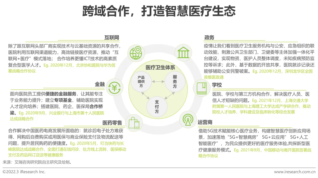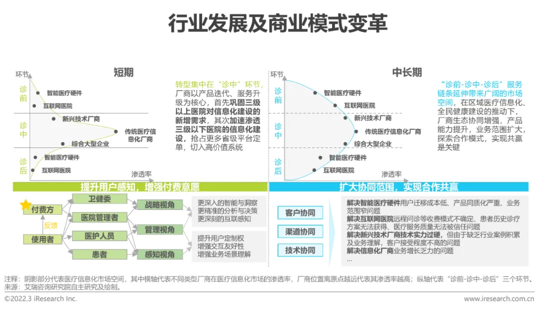从现状看,由于传统医疗行业信息化市场厂商众多,市场集中度较低,新兴厂商具备市场进入的条件。然而政府与医院议价能力较强,且看重供应商既往案例及服务团队力量,倾向于与常年合作的供应商合作;新进入者也常由于缺乏成熟的合作模式、专业医疗专家合作,其产品与服务的专业性受到质疑。如何打破服务壁垒、技术壁垒,探索可持续发展的商业模式,高效转化客户,打开市场成为当下首要任务。艾瑞认为新进入者应当面向不同类型客户、灵活地分阶段调整市场策略,具体而言,在传统医疗信息化的赛道上,一方面新进入者可以通过与老牌厂商合作进入市场,基于技术与资源置换,在获得服务经验与行业理解的同时,让思维较为固化的客户切身体会产品效能,提升品牌口碑,保障企业增长;另一方面从企业自身出发,明晰产品定位,技术、服务(尤其是人才)“多手抓”。此外,无论是新兴医疗市场,还是全民健康建设都处于起步阶段,新进入者也可提前布局这部分市场,提升市场地位与核心竞争力。