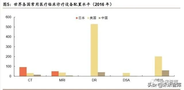 其次,中高端临床诊疗设备配置水平增长空间仍很大。2016 年,我国每百万人 CT 保有量约为 16 台,而美国每百万人 CT 保有量约为 32 台,日本则约为 93 台,我国人均 CT 保有量仅约为美国的 1/2 和日本的 1/6。我国每百万人 MRI 保 有量约为 6.4 台,仅不到 OECD 国家平均水平的一半,不及美国与德国的 1/5 和 日本的 1/7。我国 DR 总保有量约为 5.5 万台,每百万人拥有的 DR 数量达 41 台, 而美国每百万人拥有的 DR 数量则高达约 530 台。我国 DSA 总保有量约超过 4000 台,每百万人拥有的 DSA 数量仅有 3 台,而同期美国每百万人拥有的 DSA 数量约为 33 台,我国人均 DSA 保有量尚且不到美国的 1/10。
