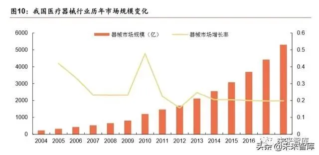 我国医疗器械行业规模从 2006 年的 434 亿元增长至 2018 年的超过 5000 亿元, 年均复合增长率约为 23.5%,是医药行业的优质赛道。