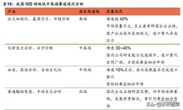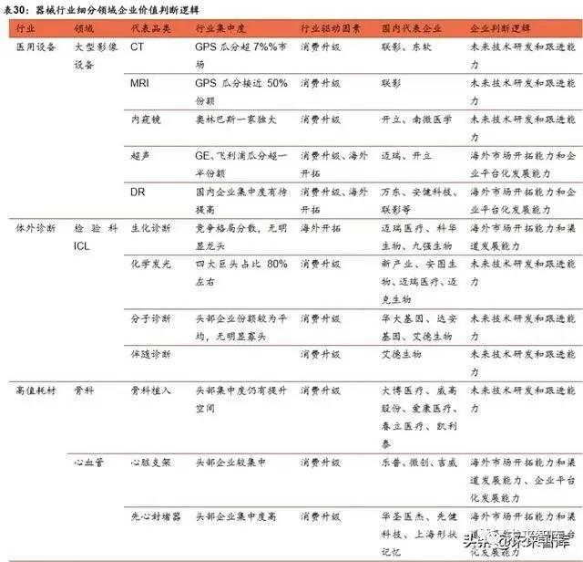 对于技术壁垒高的领域,国内企业技术跟进程度一般较低,比如关节类骨科耗材;化学发光、分子诊断、伴随诊断等 IVD 细分领域;MRI、内窥镜等大型影像设备。这类赛道由于技术壁垒高,在行业消费升级的大趋势下,国内配置普及率普遍仍 有较大提升空间,目前多数处于行业高增长的态势。这一赛道的国内企业多通过 在产业链某一环节的技术切入,基于性价比和渠道优势,在基层机构市场内进行 争夺,企业中长期的价值判断逻辑则需要基于未来技术研发和跟进能力。