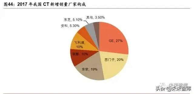 根据中国医学装备协会发布的数据,2017 年我国新增 CT 采购中,GE 占 27%、 西门子占 20%,飞利浦占 10%,国际巨头 GPS 合计占 57%的份额。
