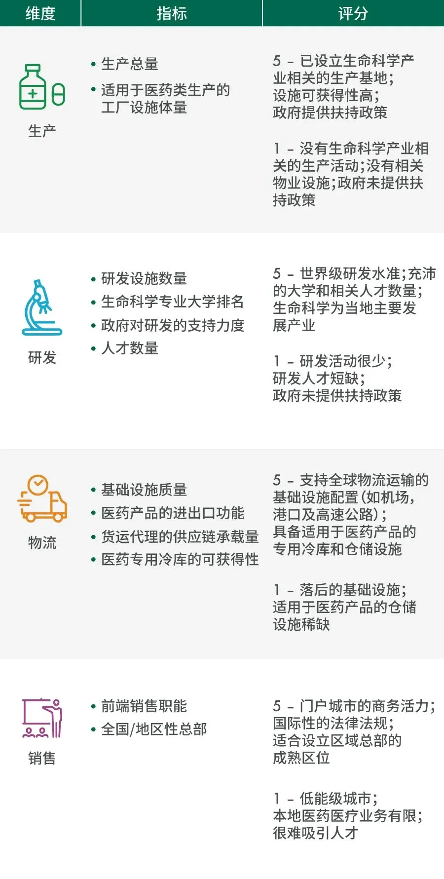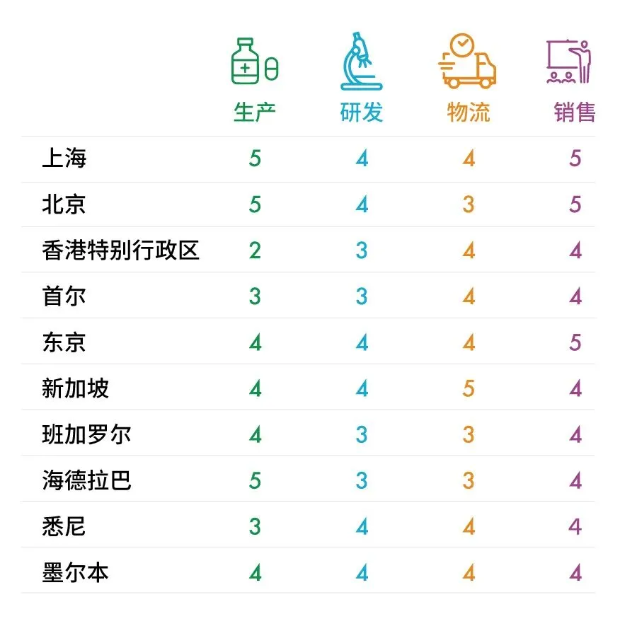 医药行业对于房地产的需求与各市场的综合实力和增长潜力相关。因此,CBRE依据生产、研发、物流、销售等四大维度共12个指标对亚太区内主要市场的竞争力进行评估,发现北京和上海以其生产和研发能力以及庞大的国内消费市场,成为亚太区较有竞争力的城市。