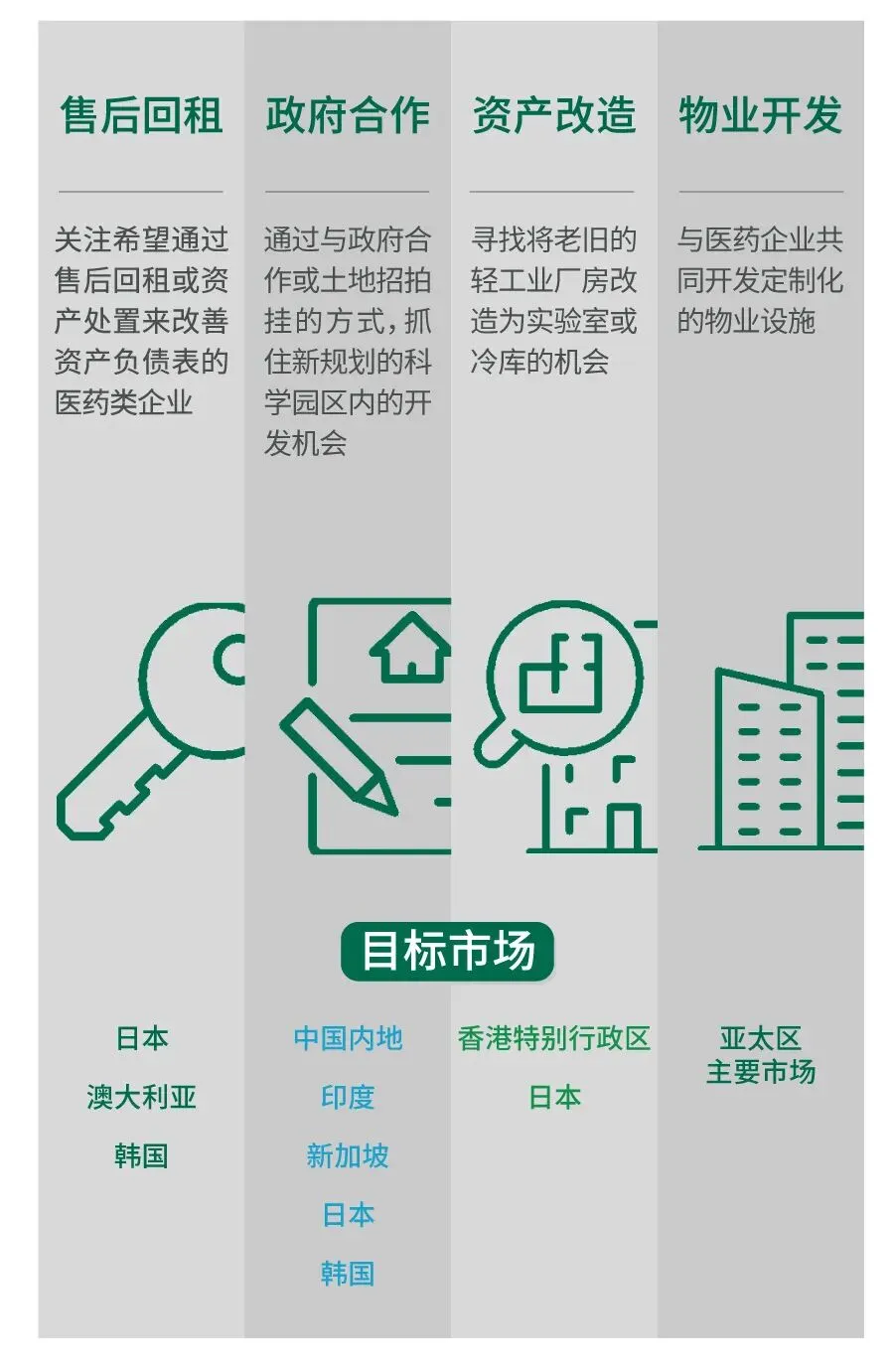 尽管作为投资性物业,医药类地产仍处于发展的初始阶段,但CBRE认为此类资产具备巨大潜力。寻求收益性资产机会的投资者可考虑医药企业售后回租或出售的标的,此类企业往往是在并购后希望改善其资产负债率或者处置一些非必要资产。增值型资产投资者则可考虑将老旧的轻工业厂房改造为技术要求较低的实验室或冷库。该策略更适用于医药类土地供应有限的地区如香港特别行政区。因项目涉及排污、电力、通风等问题的处理,可以考虑与专业运营商进行合作。