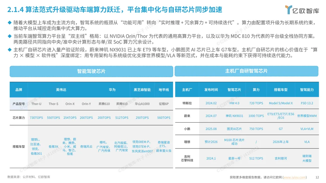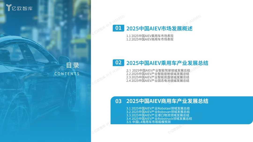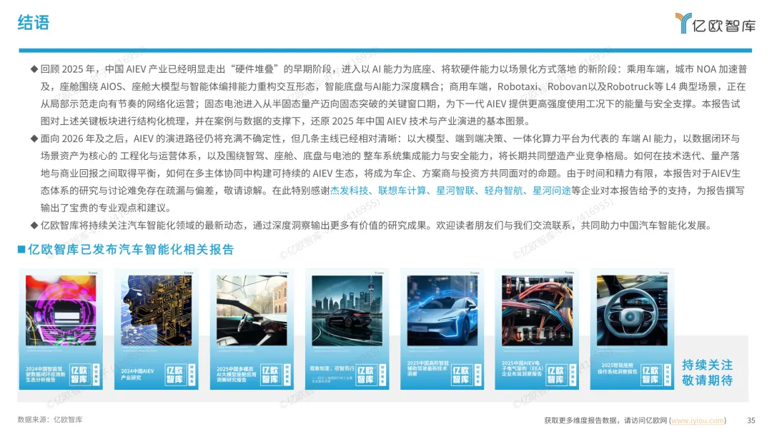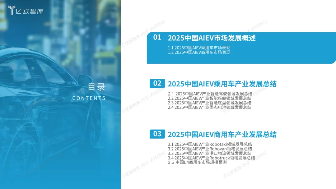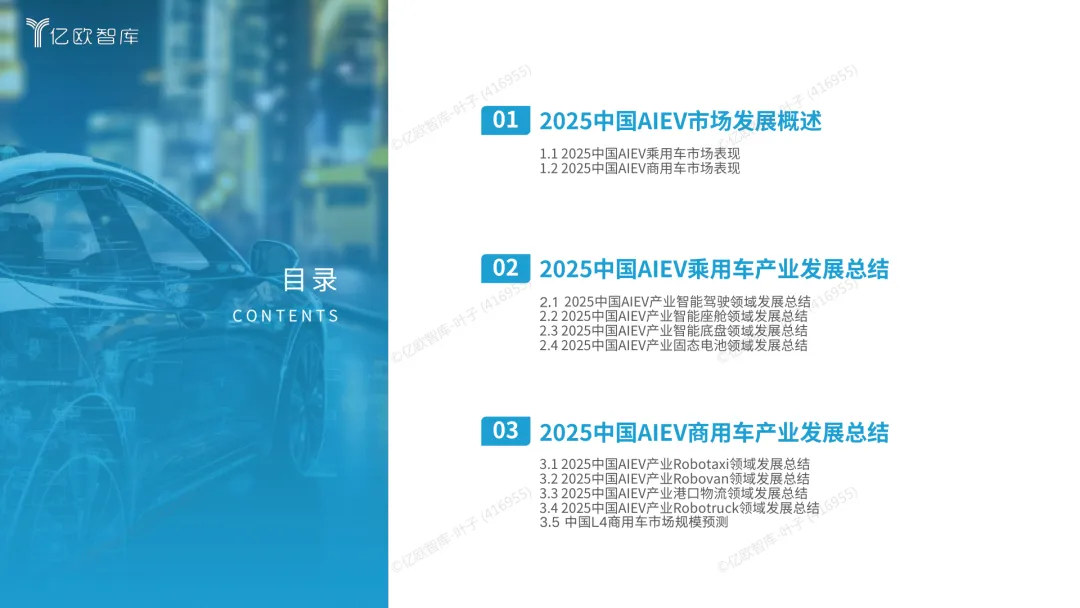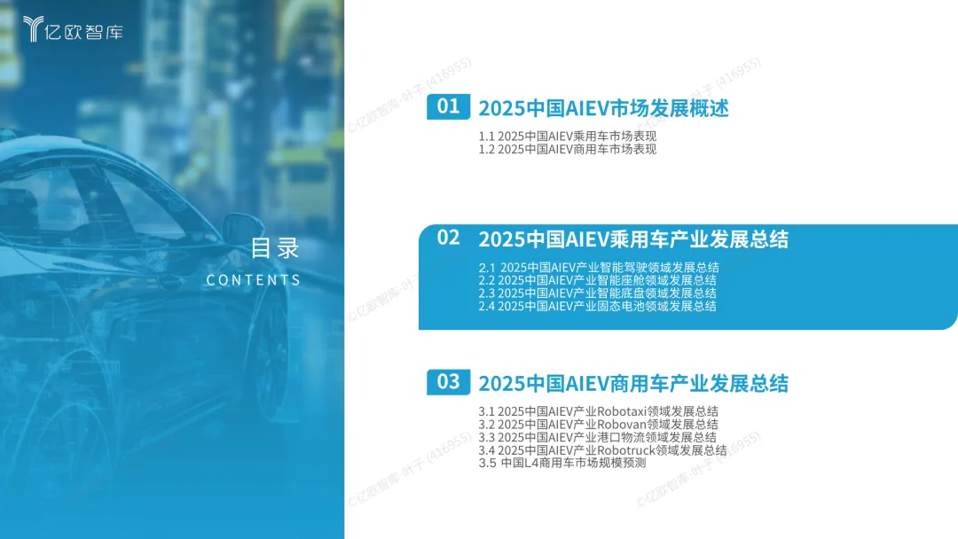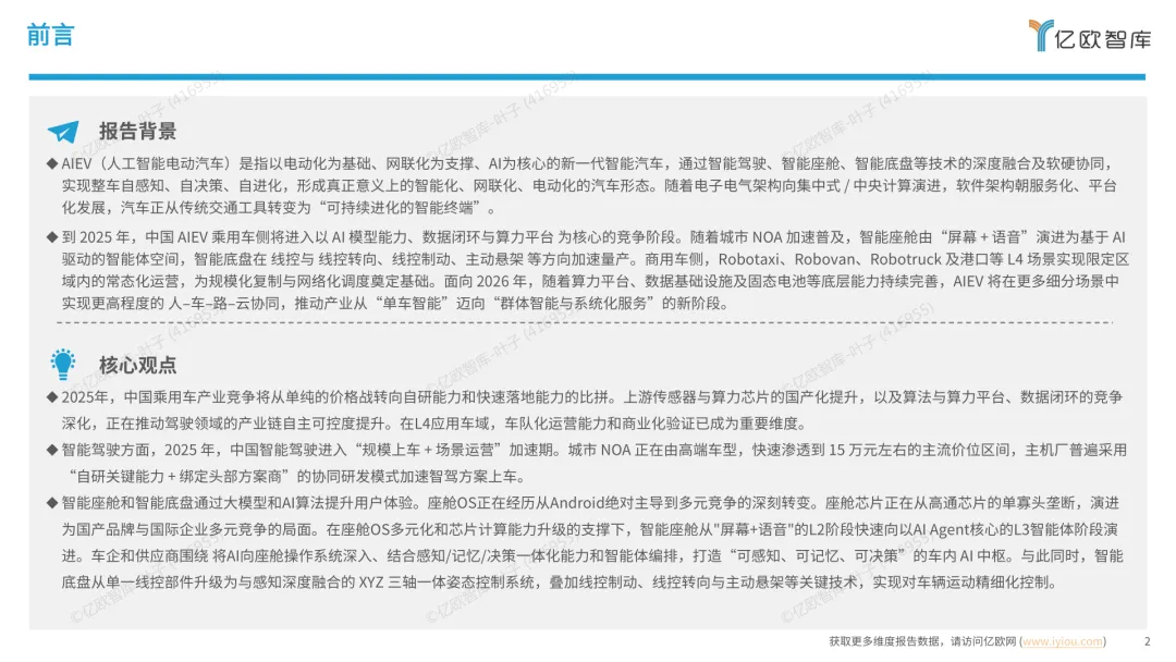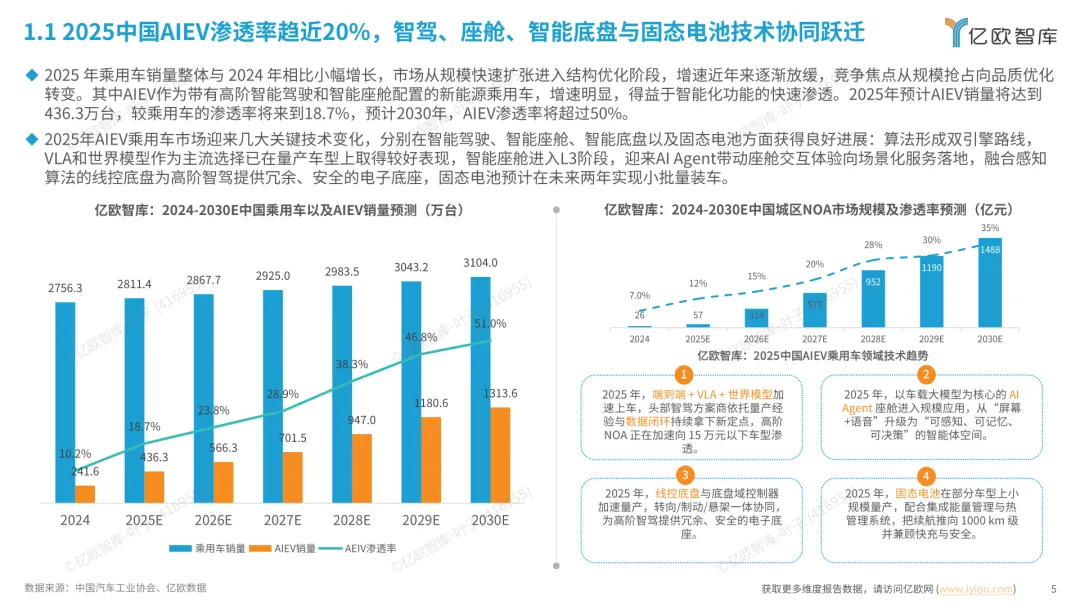 导读:报告梳理 2025 年中国人工智能电动汽车(AIEV)产业发展态势,涵盖技术演进、应用场景与市场前景,为行业发展提供参考。2025 年中国 AIEV 市场规模达 436.3 万辆,同比增长 18.7%,预计 2030 年渗透率将升至 50%。技术层面,VLA 架构与 AI Agent 成为核心驱动力,L3 级自动驾驶加速落地,特斯拉、蔚来、华为等企业推出多款搭载高阶智驾系统的车型,芯片算力普遍突破 200TOPS,全场景 NOA 功能覆盖持续扩大。应用场景不断丰富,Robotaxi、Robovan、Robotruck 等商业化探索提速,L4 级自动驾驶在城区配送、干线物流等场景实现规模化试点。固态电池技术取得突破,能量密度超 400Wh/kg,续航能力迈向 1000 公里级。产业生态持续完善,芯片、传感器、操作系统等核心零部件供应商与车企深度协同,推动 AIEV 产业向智能化、规模化方向稳步进阶。