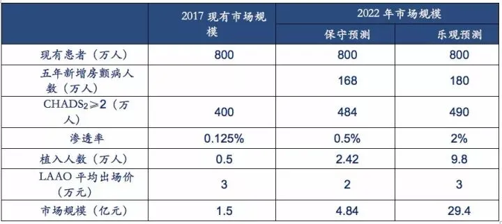 这个市场规模测算用到不少假设,比如新增患者数的测算,渗透率的取值。还需要用到报告第一章整理的专家共识和治疗建议数据。某券商曾给左心耳封堵产品做过市场规模预测,相比之下我们的数据还是有一定出入的,希望大家能在测算新产品的市场规模时,保持独立思考。