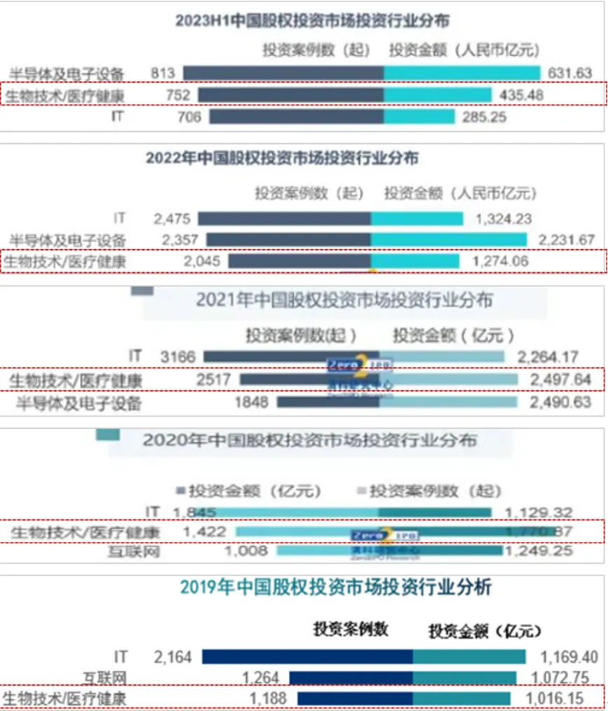 (一)一级市场方面,医疗健康行业投融资数量一直维持在前三
