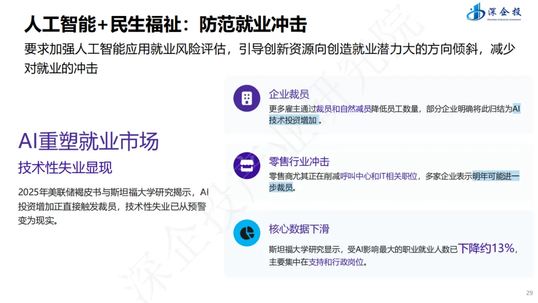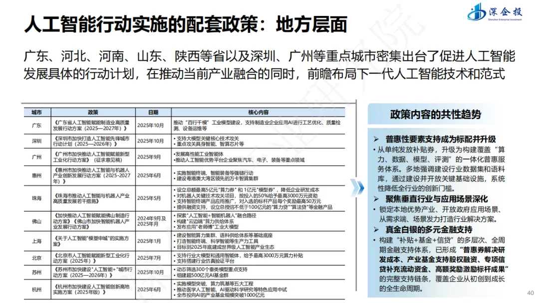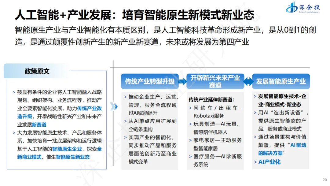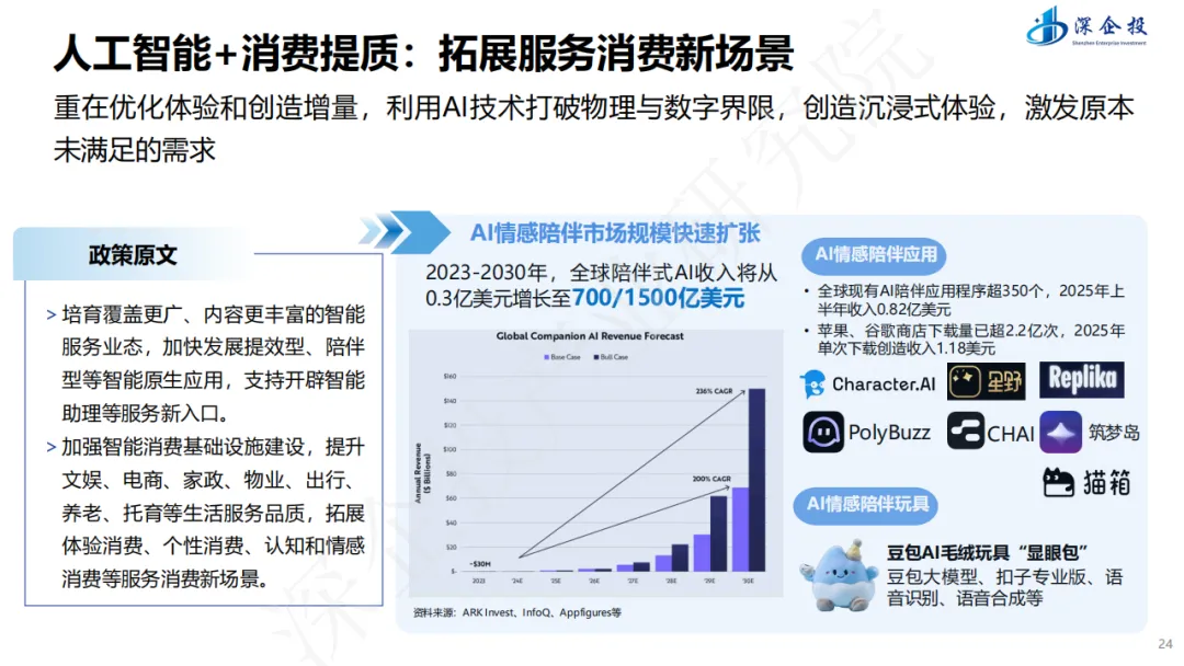《“人工智能+”行动》以“三步走”勾勒智能时代路线图:2027年深度融合、2030年全面赋能、2035年全面智能。围绕“5项原则、6大场景、4类新成果”,政策聚焦“模型、数据、算力、人才、开源、安全”六大底座,提出建设国家智算体系、高质量数据集、开源社区和中试基地,并配套“算力券、模型券、算力贷”等金融工具。产业层面,报告区分“产业智能化”与“智能原生产业”:前者通过AI重构设计、生产、供应链全要素,提升传统行业劳动生产率;后者则创造机器人、AI眼镜、智能网联汽车等全新终端和服务,催生“第四产业”。农业、工业、服务业均被赋予AI升级路径,而消费端则强调情感陪伴、智能终端等增量场景,预计2030年全球AI陪伴市场规模将达1500亿美元。