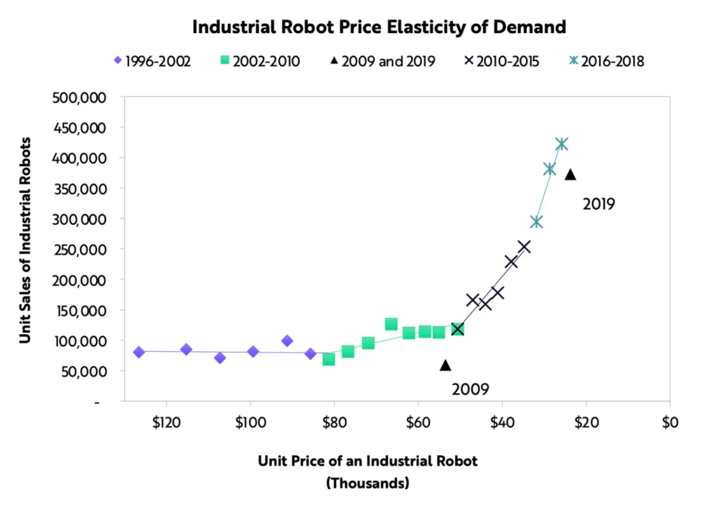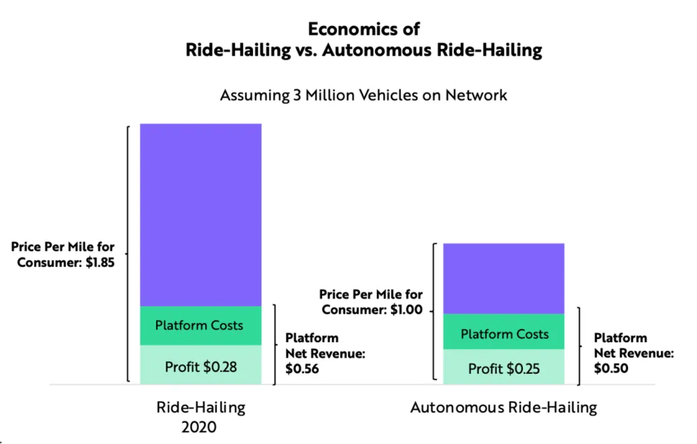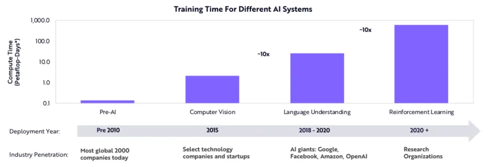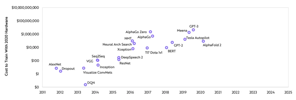 虽然硬件和软件的进步使得AI的培训费用呈每年下降37%的趋势,但是AI的市场体量增长的更快,达到了每年10倍。结果就是,AI的总训练费用不断增加,远远超过了源自硬件、软件进步所节约的成本。ARK认为,最先进的AI训练模型的成本很有可能增加100倍,从目前的大约100万美元提高到2025年1亿美元以上。