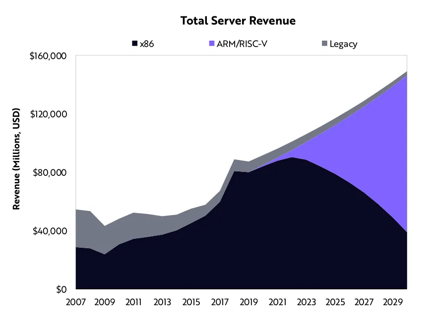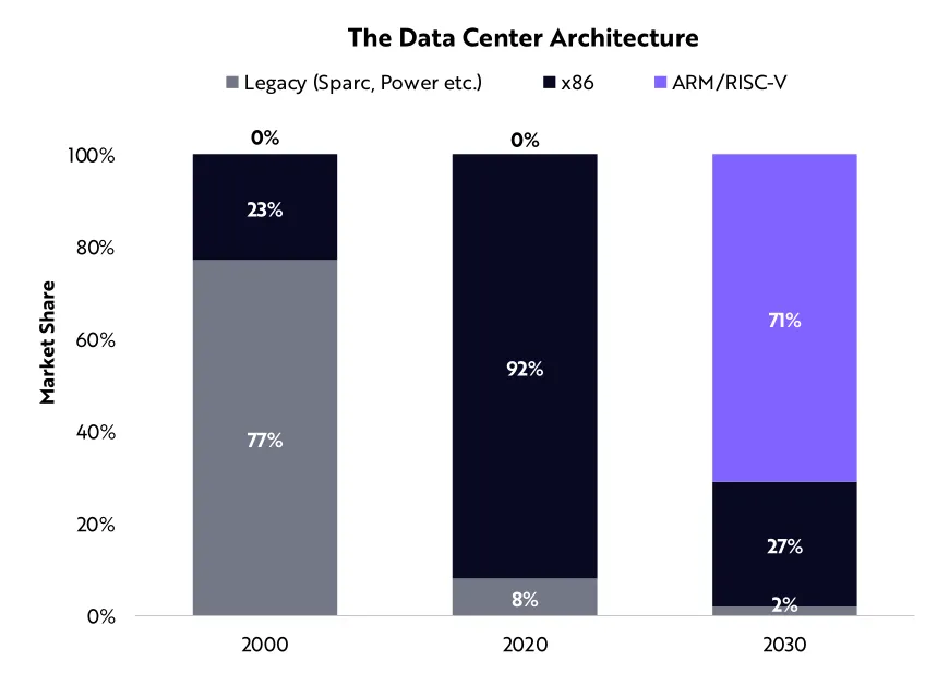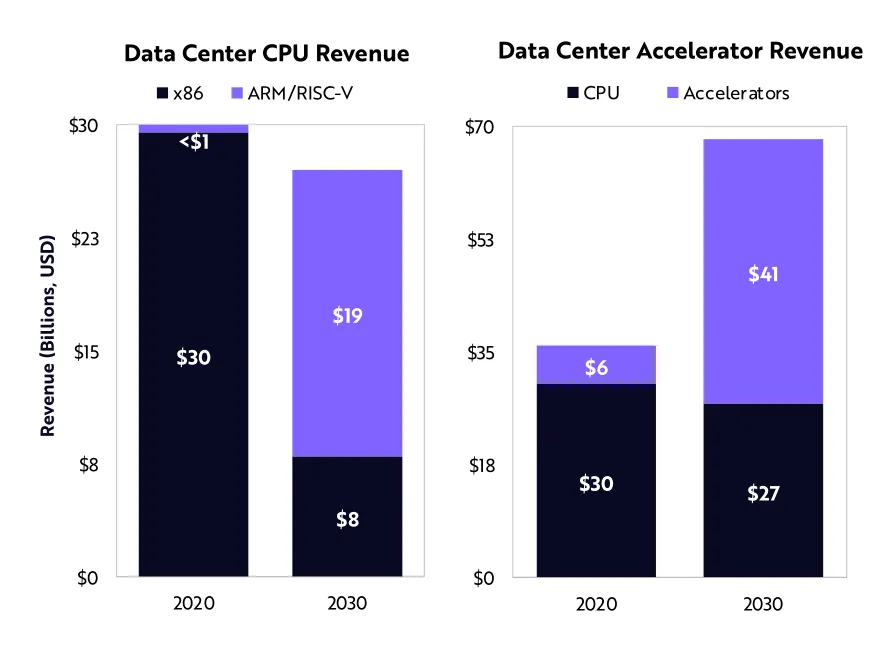 我们相信,ARM+RISC-V的组合所占据的服务器市场份额,将从2020年的零,增加到2030年的71%。