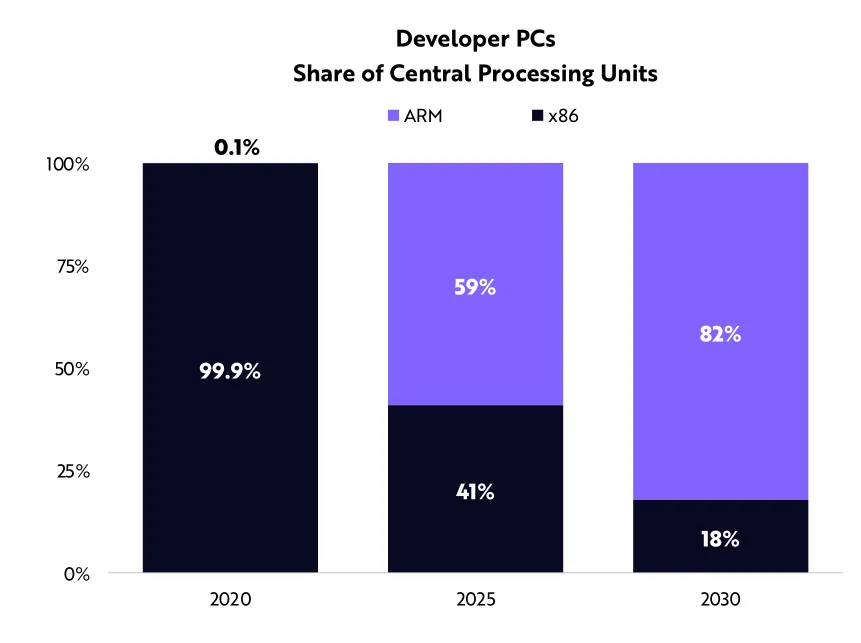 根据ARK的研究,到2030年,大多数开发人员都可以使用基于ARM的CPU运行的电脑,那将标志着英特尔x86时代的终结。
