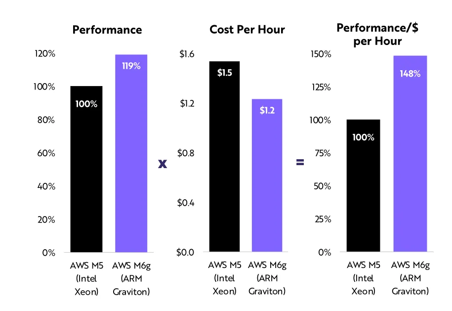 亚马逊AWS 的Graviton 2要比英特尔CPU更便宜,处理速度更快,每一美元可提高48%的性能。